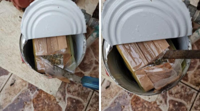 Esto, como resultado del cateo realizado en el inmueble marcado con el número 31 de la Calle Hormiguillo en la colonia Jardines del Tacaná de Tapachula, donde fueron aseguradas 19 latas que contenían paquetes de forma rectangular con mariguana, confeccionados con cinta canela.