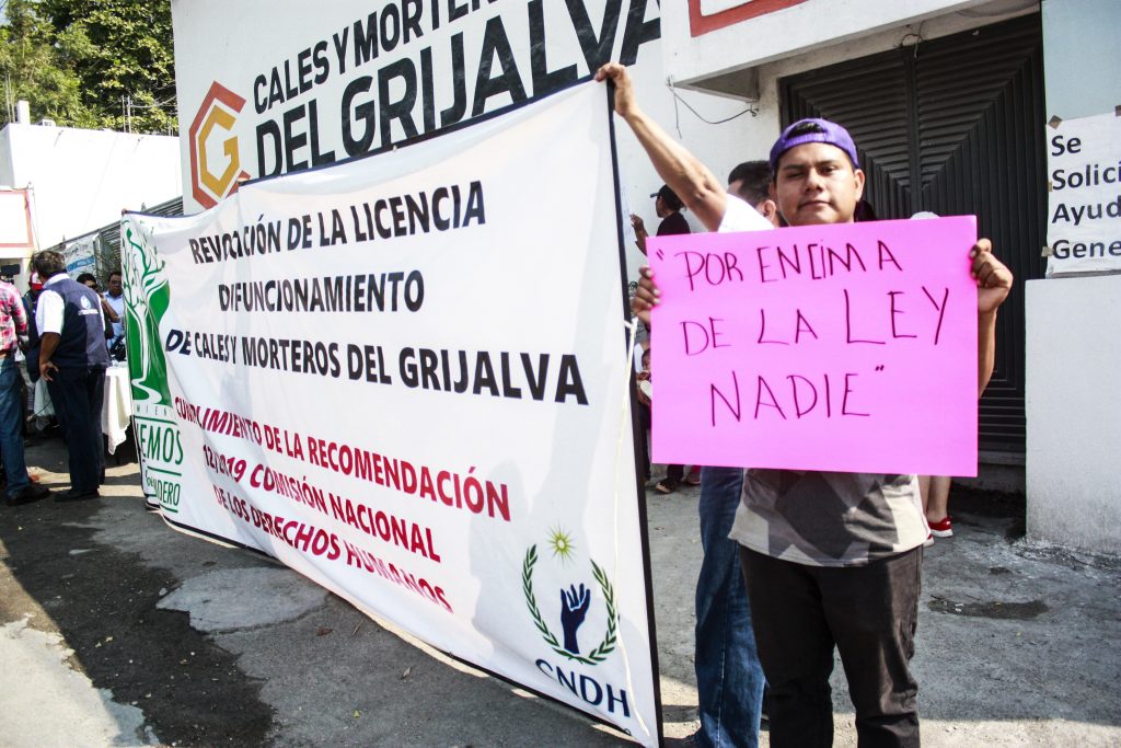 “Exigimos inmediatamente a la Semarnat y al gobierno estatal la revocación de la licencia a Calas y Morteros del Grijalva”, señaló uno de los vecinos que con pancartas exigían el cierre de la calera.