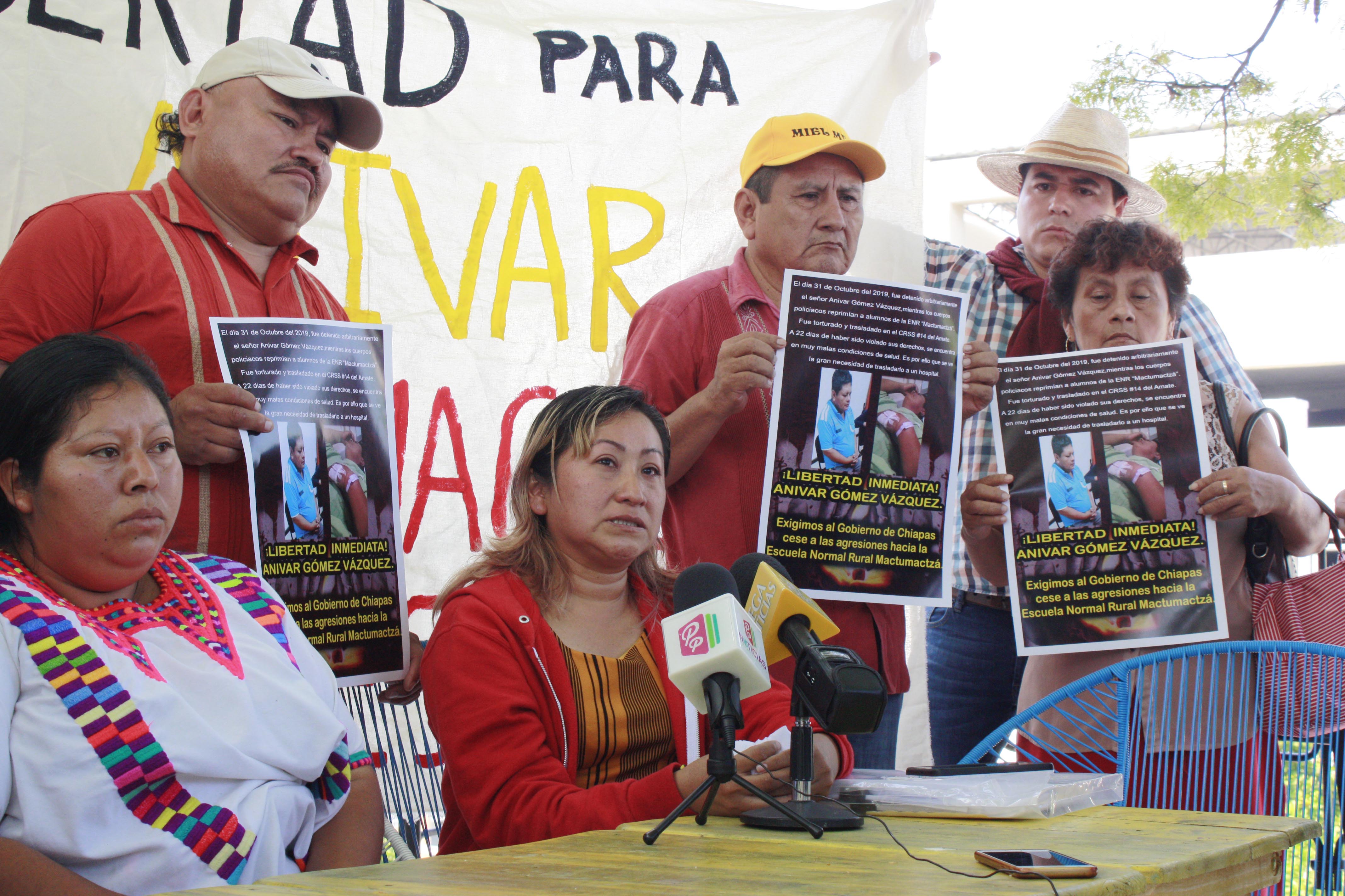 Acompañada por normalistas, desplazados de Chenalhó y Ocosingo, miembros de la Red de Resistencia y Rebeldía e Integrante del Frente Magisterial Independiente Nacional, Pérez de la Torre informó que Gómez Vázquez se encuentra en El Amate acusado de Robo, Secuestro y Ataques a las vías de comunicación, y exigió atención médica especializada a su marido quien se encuentra internado en  la clínica del penal debido a los golpes recibidos el días de su detención, presuntamente arbitraria.