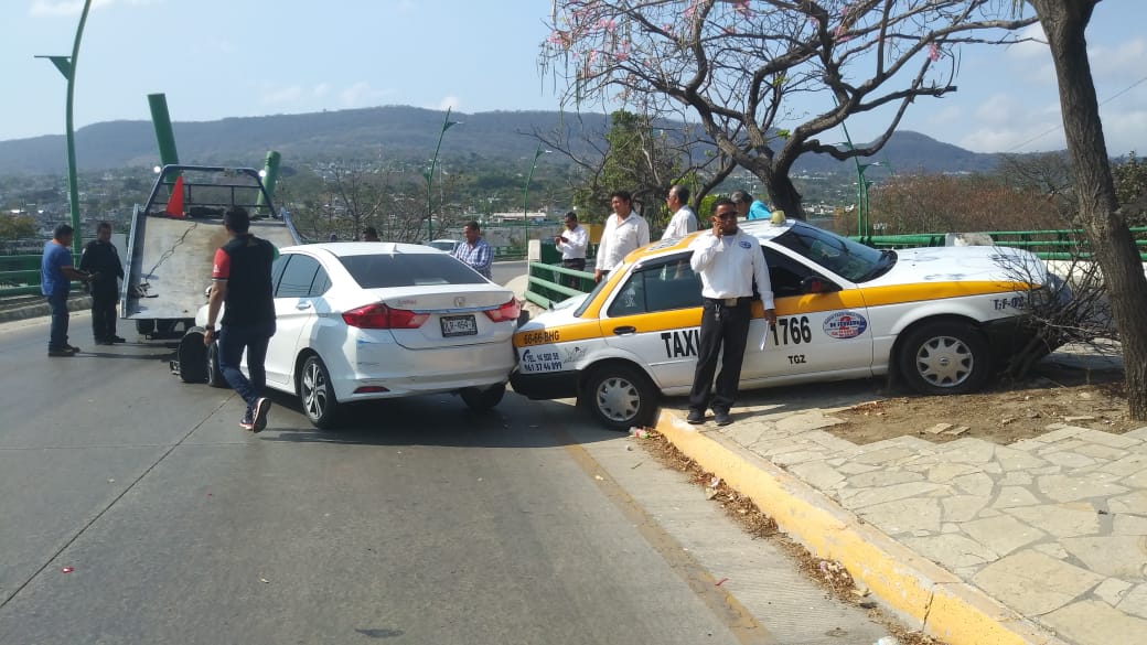Tuxtla Gutiérrez (Ch24/7). Este jueves se registró un accidente vial entre un taxi y un vehículo particular sobre la prolongación donde convergen ambos libramientos, a la altura del Parque “Chiapasiónate y sobre el puente vehicular; no se registraron lesionados.
