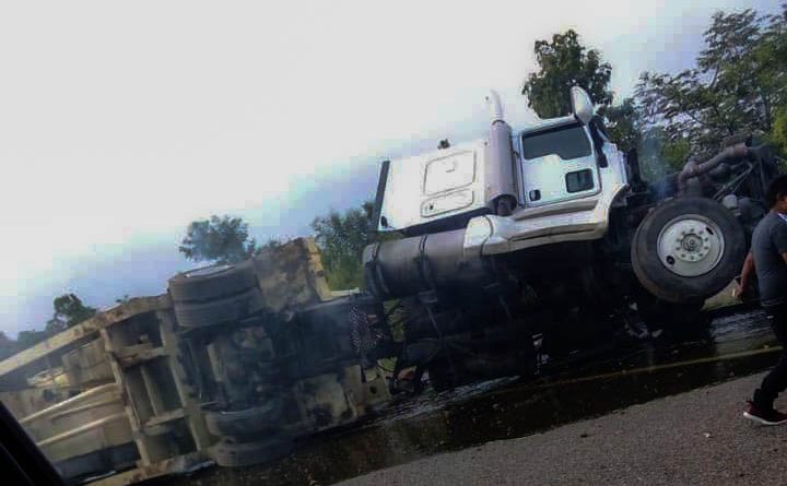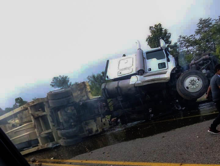 Vuelca tráiler que cargaba transformador de la CFE; chofer grave