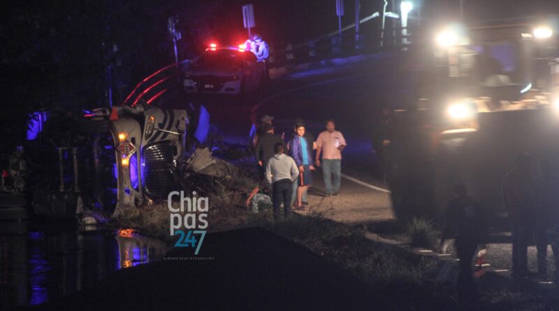Chiapa de Corzo (Ch24/7). El chofer de una pipa cargada con chapopote murió esta noche de domingo, luego de que la unidad volcara debido a una presunta falla mecánica.